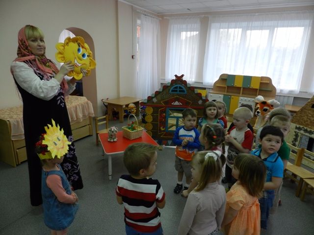 Материалы: русский народный костюм для бабушки, игрушка - петушок, грамзапись песенок «Петушок», «Солнышко», плясовой, маска-шапочка солнышка, игрушка кота , корзинка с угощением.